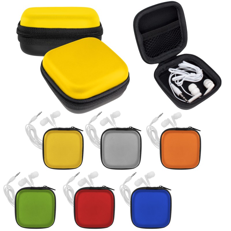Zippered square molded case stores ear buds. The case has colorful top and black bottom and zipper and mesh pocket for accessories. White ear buds included. Complies with Prop 65. 3″ L x 3″ H x 1.4″ W