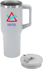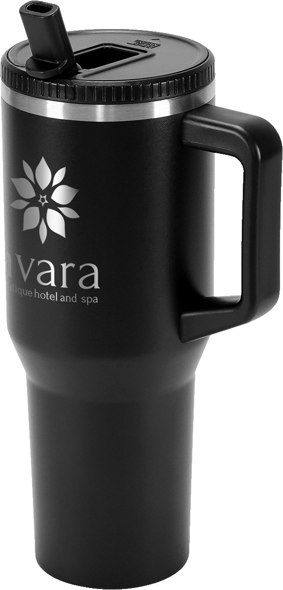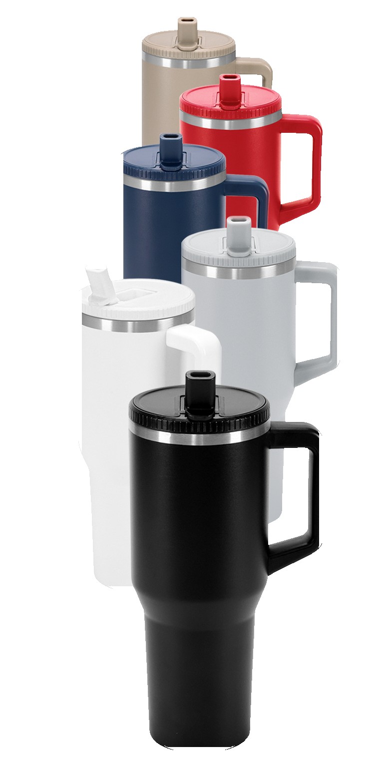 Copper lined, vacuum insulated liner, dual walled stainless-steel construction with sturdy PP plastic handle. Features screw on lid with built in flip straw. Fits most cup holders. Patent pending. 10.5″ H x 5.5″ W x 4″ D