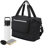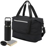 Expandable duffel bag folds easily for travel and storage, made from PVC-free smooth matte polyester fabric Features the Voyage Folding Duffel Bag (BG385), Boompods TWS Sleep DreamBuds (EL229), Dual Port Bamboo/rPET Power Bank 5,000mAh (EL226), and 28 oz Urban Peak Dual Top BC Water Bottle Water bottle features copper-lined vacuum insulation with a dual top carry handle Power bank has dual ports, FSC bamboo exterior, and rPET fabric with 3 hours of recharge time 1-year limited warranty on. 8″ D x 14″ W x 18″ H