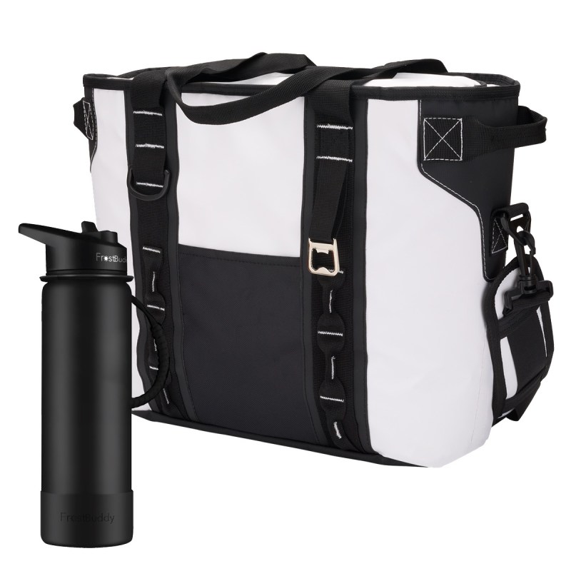 Features 1 piece of the Frost Buddy® 24 Oz. Sports Buddy packaged inside the Urban Peak® Waterproof 24 Can Hinge Cooler. Cooler bag constructed of rugged waterproof 55C PVC Mesh Tarpaulin. Drinkware features double-wall, vacuum-insulated Stainless Steel to keep contents cold for 24+ hours; warm for 12+ hours. 1-year limited warranty. 6.5″ D x 16″ W x 13″ H