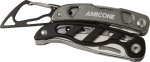 Nylon pouch included Includes large knife blade, serrated knife blade, needle nose and regular pliers Wire cutter, flat head screwdriver/file, Phillips screwdriver/bottle opener and carabineer Features an Aluminum body and Stainless Steel implements. 1.625″ D x 4.75″ W x 0.625″ H