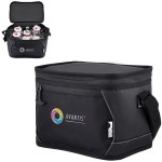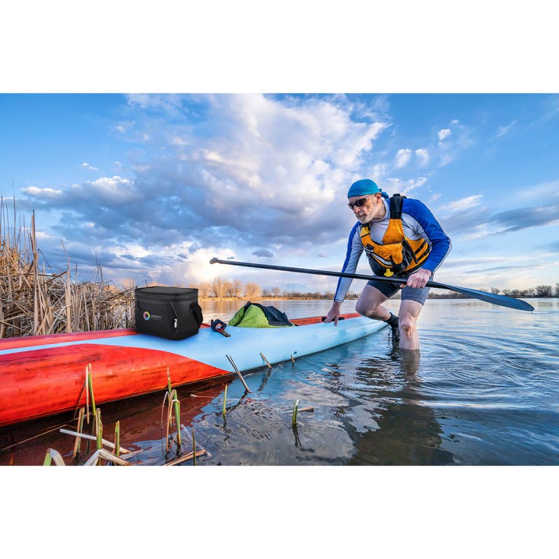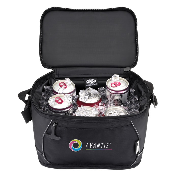 Rugged and waterproof top-loading 6 can cooler featuring thick foam insulation. Constructed from 500D Tarpaulin, matte 55C PVC, 38c PVC lining, 8mm foam with 840D pocket. Leak-resistant, heat-sealed liner. Features a main compartment, front zippered pocket, water resistant zippers with easy grip zipper pulls and an adjustable shoulder strap. 1-year limited warranty. 7″ D x 11″ W x 7″ H