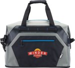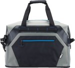 1-year limited warranty Adjustable and removable padded shoulder strap Hook and loop closure on padded handles Durable top-loading 36 can waterproof cooler Wide opening, zippered top allows for quick accessibility Constructed from waterproof double coated 840D TPU, FDA approved thick inner liner (45C), 10mm double Foam insulation, and Vegan Leather Features blue zipper/stitch trim, easy grip zipper pulls, front zippered pocket, front side daisy chain, side handles and an elastic-secured. 9″ D x 18″ W x 16″ H