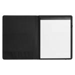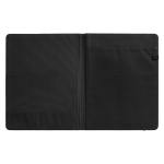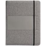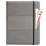 The Urban RPET Portfolio Notebook – 12.6″ x 9.84″x .40″, crafted with a linen-look RPET cover and a recycled PU band in a matching tone, measuring approximately 3.94″ wide and sewn with light gray thread for a touch of subtle sophistication. The cover material is securely attached to a sturdy chipboard base, with a foam layer to provide extra structure. The interior is lined with black RPP, and a robust elastic strap is sewn into the back cover for a secure closure. Inside, the left side features a folder flap for documents and two slots for cards, while the right side includes a black elastic pen loop for easy access. The right section also has a slot to hold a refillable legal pad, which contains 30 sheets (60 pages) of college-ruled paper sourced from responsible forestry, bound at the top with glue and backed by chipboard. Ideal for the stylish professional, this portfolio keeps everything you need organized and easily accessible. Complies with Prop 65. 12.60″ H x 9.84″ W x 0.39″ D