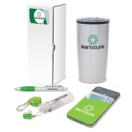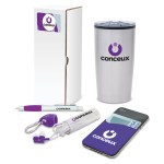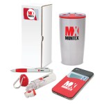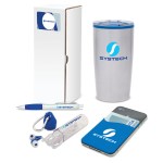 The Valued 4-Piece Thank You Gift Set is a thoughtful gift for employees, customers and colleagues. It comes packaged together in a customized gift box and has a 20 oz. double wall, stainless steel tumbler with polypropylene liner a clear slider lid and and silicone stereo earbuds that come in a clear case with a carabiner clip. These items are useful and convenient to use at work and when working out at the gym. This set also includes a silicone phone wallet with an adhesive back that holds several credit cards, access cards or ID cards and a plunge-action ballpoint pen with a matte silver barrel and translucent colored rubberized grip. Send the Valued 4-Piece Thank You Gift Set to your employees and let them know that they’re VALUED. Complies with Prop 65. 3 1/2″ W x 7 1/16″ H x 3 1/2″ D