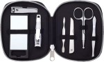 The Bullet Vanity 7-Piece Personal Care Kit includes a zippered case with an open top pocket on front cover. This handy hygeine kit includes a personal mirror, fingernail clipper, toenail clipper, cuticle tool, nail file, scissors and tweezers. 1.13″ D x 4.44″ W x 5.19″ H