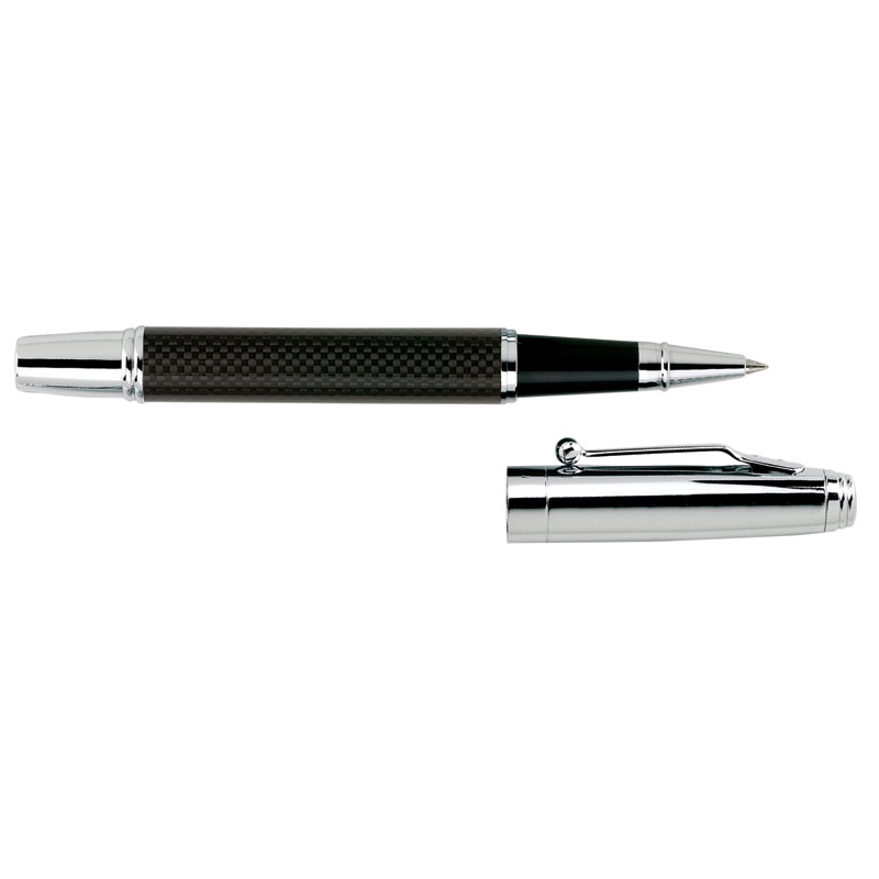 Euro-style cap-off rollerball with brass cap, a high-gloss carbon fiber barrel, and chrome pocket clip and trim. Complies with Prop 65. 5/8″ W x 5 1/4″ H x 1/2″ D