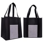 Elevate your branding with our sleek black polyester grocery tote featuring a convenient gusset for extra storage space. The tote also includes a striking white pocket to prominently display your full-color logo, ensuring your brand stands out wherever you go. Complies with Prop 65. 11.75″ L x 14″ H x 7.75″ W