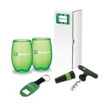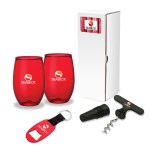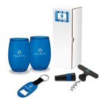 The Vineyard 4-Piece Picnic Gift Set has some of your favorite picnic items. This set includes two 16 oz. USA-made shatter-proof PET wine tumblers. Drink your favorite wine or coffee in this tumbler as you relax and enjoy your picnic. Use the 2-in-1 steel corkscrew and bottle stopper to open your wine and preserve it after it’s opened and use the aluminum bottle opener keyring to open your soda or beer. The bottle opener comes with a web strap and split ring for keys. Complies with Prop 65. 3 1/4″ W x 9″ H x 3 1/4″ D