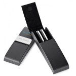 Black vinyl pen case with chrome plate.. Fits up to three pens, pencils or rollerballs.. Price shown is for packaging only products are sold separately.. Rollerballs have a one year shelf life and are not inserted. 6.5000″ L x 2.0000″ W x 1.0000″ H