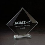Created from brilliantly polished clear glass, this diamond shaped award will gleam with your corporate logo or recipient name. 9.75″ W x 8.125″ H x 2.0″ D