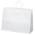 The Vogue White Shopper is made with white kraft paper and features twisted paper handles and a serrated cut top. 16″ W x 6″ D x 12″ H