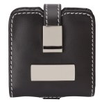 Stylish drop-down travel alarm clock features white contrast stitching, snap closure and laser engraved metal plate imprint. Complies with Prop 65. 2 1/2″ W x 2 3/4″ H x 3/4″ D