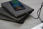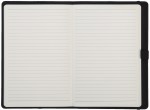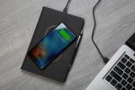 The Walton Charging Refillable Journal allows you to conveniently charge your smartphone on its wireless charging pad*. The black, textured, stitched cover has a matching pen loop and elastic privacy closure. A refillable notebook contains 80 sheets of FSC® Mix cream, lined filler with black paperboard covers. Includes a blind deboss imprint up to 4″ x 1″ on the cover, and (1) full-color 1-sided tip-in at front.* This item supports wireless charging on smartphone devices when connected to a power source via micro USB cable (included). 5.75″ W x 8.75″ H