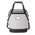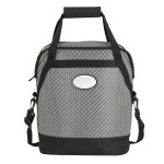 20-can cooler with woven poly mesh fabric and black trim, zippered main compartment with heat-sealed PEVA lining, carry handles with hook and loop pad, 1 1/2″ x 46 1/2″ removable and adjustable shoulder strap. Complies with Prop 65. 11 1/2″ W x 13 3/8″ H x 8 3/8″ D