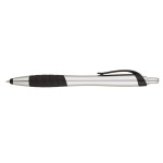 Plunge-action ballpoint pen features a metallic color barrel, black clip, black rubber grip with four matching color oval accents, chrome trims and a capacitive stylus that works with touch screen devices. Pen refill extends through stylus tip. Black ink. Complies with Prop 65. 11/16″ W x 5 3/4″ H x 1/2″ D