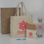This Weekender Eco Pack Kit is Perfect for Your Next Event! Each kit is packaged individually in an attractive patterned craft mailer with craft crinkle paper for filler. Add your custom message or logo to each item in the kit. Each set includes a 27 oz. Spirit Water Bottle, 10 oz., 100% Cotton Canvas Tote, Saratoga Cork Journal and rPet Marcello Pen. Perfect to give to new staff, team members, students or clients. Complies with Prop 65.