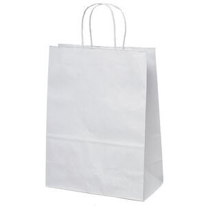 These popular white kraft-paper shoppers are functional, affordable and available in small to medium sizes. Include matching twisted paper handles and serrated cut top. Complies with CPSIA, C-TPAT, FDA, Prop 65. 10″ W x 5″ D x 13″ H