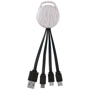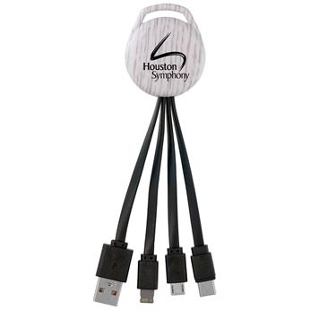 3-in-1 charging cable with White wood-look case. Multiple USB adaptor; Patented; • Compatible with 8-pin devices, Micro USB, Type C USB. Complies with CE, Prop 65. 1.5″ L x 6.5″ H