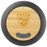 The Garm Fabric & Bamboo Speaker with Wireless Charging is perfect for the desk or countertop. The on-trend mixed material appearance of the bamboo and fabric wrap will get anyone’s attention. The 3-Watt output of the speaker produces crystal-clear sound. Plus, the top part of the speaker is a 5-Watt wireless charging pad that’s capable of charging any compatible device. For wireless charging, this piece must be plugged in. The built-in 1200 mAh battery will keep the music playing for over 6 hours. Built-in music controls and microphone for hands-free operation. Bluetooth® version 5.1. A USB-A-to-Type-C charging Cable is included. The top of the speaker is made from FSC®-certified bamboo. The appearance of each piece may appear different because of the natural bamboo. 5.10″ D x 5.10″ W x 3.30″ H