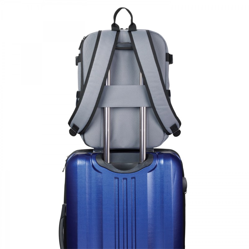 Work and play is made easy with the Workation Renew Backpack. Made from RPET material inside and out, its 2 main compartments will keep you organized so that you can effortlessly access work and personal items right when you need them. The quick-access exterior compartment fits a laptop up to 15. Its 3 large interior zippered pockets are also easily accessible and perfect for your stationery, media devices, or personal belongings. Theres a full panel front pocket for easy-grab items and a convenient strap to secure the backpack onto your extended luggage handle for travel. The adjustable compression straps ensure a more compact fit when carrying a light load, but can also help secure oversized items like a jacket, photography tripod, or towel. It also has 2 convenient water bottle pockets. 17.5000″ L x 11.8000″ W x 6.7000″ H