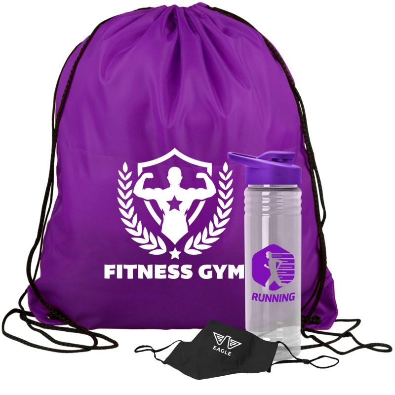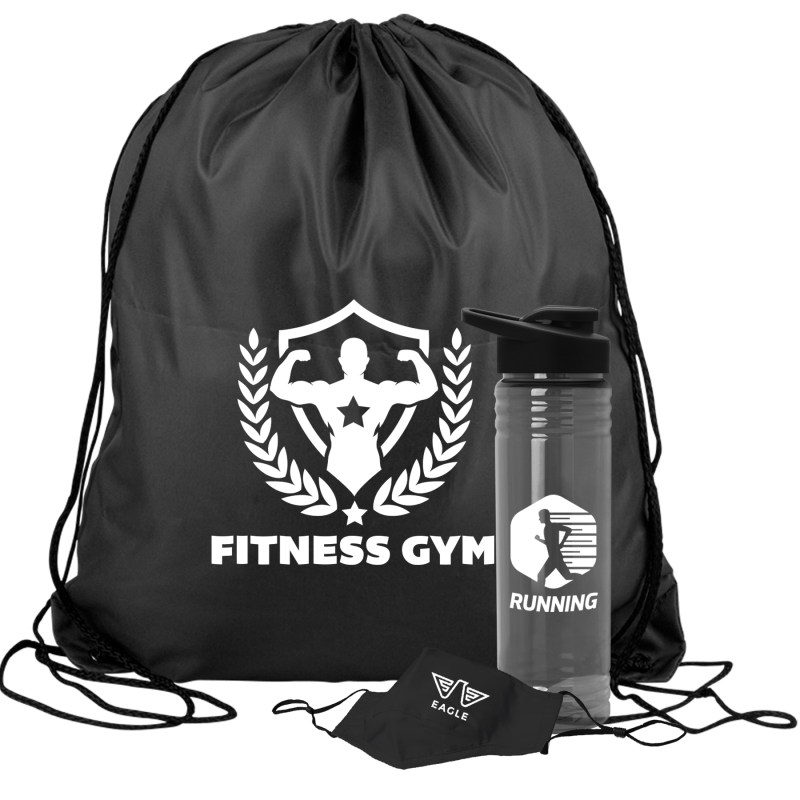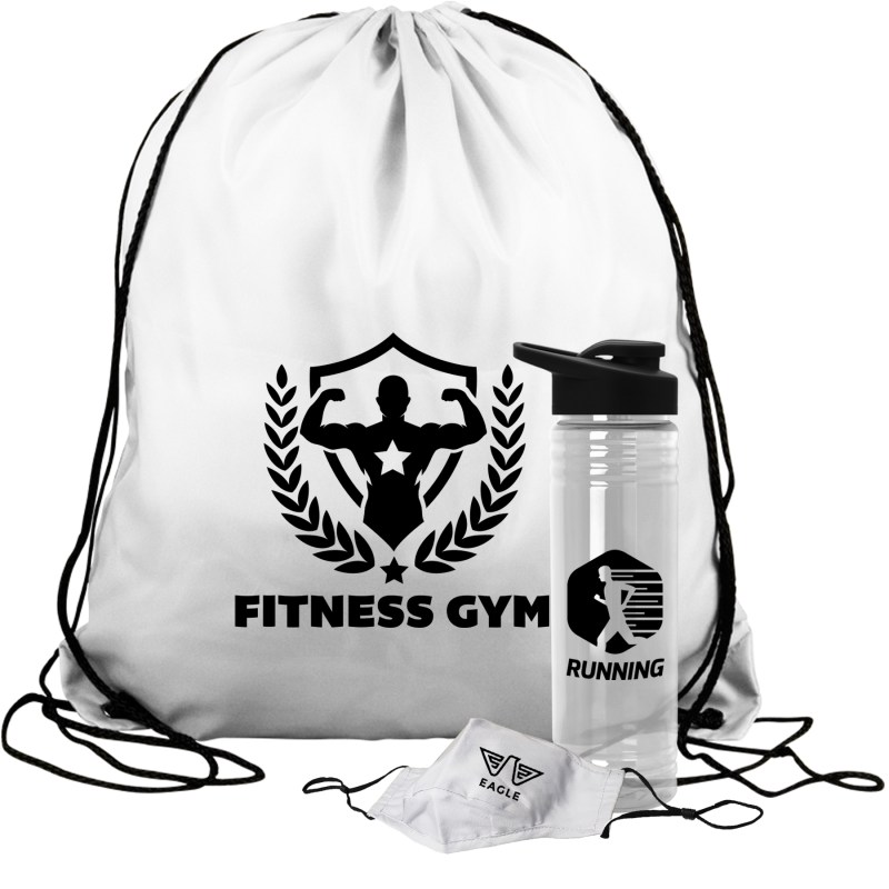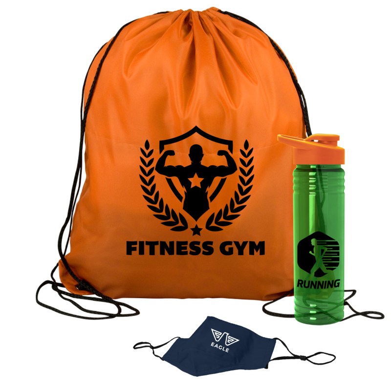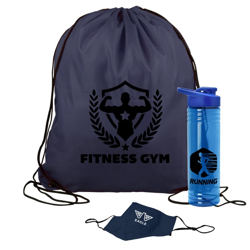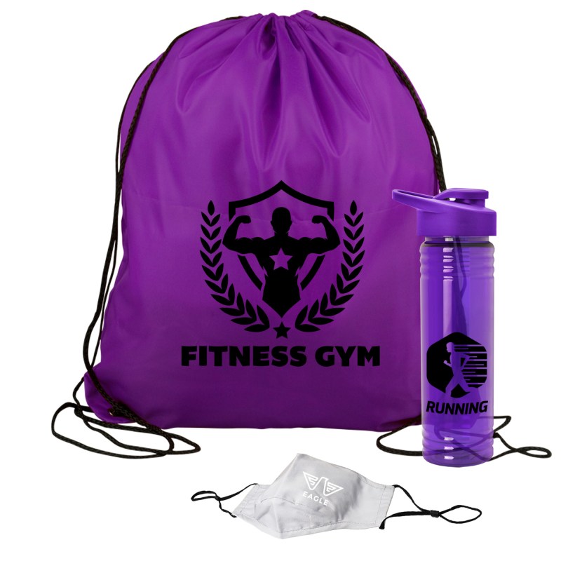 Get fit, don’t quit! Everything you need to restart. Work out safely. While protecting yourself and others. Perfect as welcome gifts for reopening fitness centers! Gym kit includes: sports bottle, 100% cotton mask, micro-fiber towel and 2 oz. Hand sanitizer gel bottle. 1 Color imprint on the bottle and 1 color imprint on the mask. Custom kits available. Complies with ANSI, CPSIA, Prop 65. 3.125″ Diameter x 9″ H