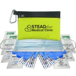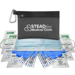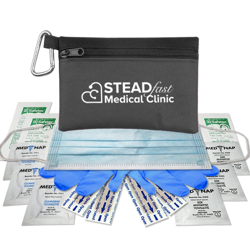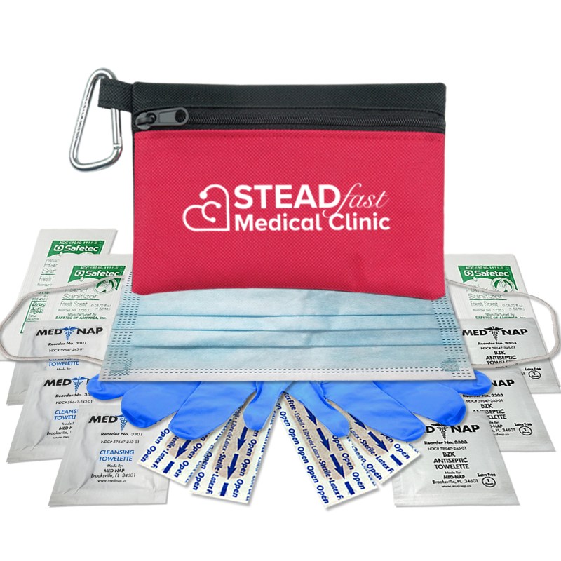Ready to ReOpen? Keep your employees and customers safe and healthy with these two tone 600D polyester zipper tote first aid kit with 50mm carabiner.Contains nitrile gloves. face mask. three hand sanitizer packets. four adhesive bandages. three antiseptic towelettes. three wash up towelettes Due to hand sanitizer this item cannot be shipped via air service. Complies with ANSI, CPSIA, Prop 65. 4″ H x 6″ W