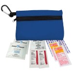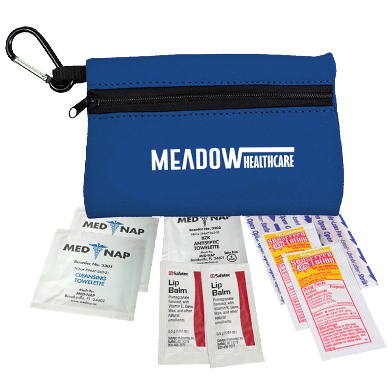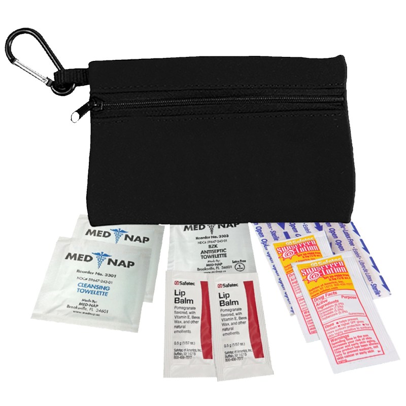 Foam lined zip bag with 50mm carabiner contains?two sunscreen packets. two Safetec packets. two latex free adhesive bandages. one antiseptic towelette. and two wash up towelettesThis item is not appropriate for children 14 years or younger without parental supervisionIndividual portioned ingredients are labeled by the manufacturer with instructions for proper usage. Complies with ANSI, CPSIA, Prop 65. 3.75″ H x 5.75″ W